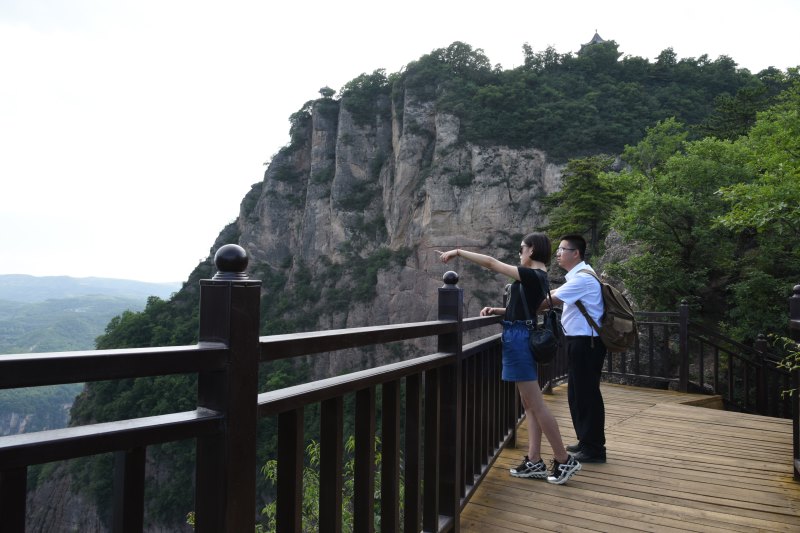 The plank road of Yixiantian distract isfrom Baxiantai to Wild Fox Bridge,with 650 m long. The whole plank road isbuilt in accordance with the mountain landforms . It is a steel and concretecantilever plank road. The the widest place is 1.5 m wide,but the narrowest is1 m wide. The winding plank road is on the precipice which flies to sky. Whenlook up the precipice, you just get a glimpse of a line of sky. At present now,it has been into the final stage ,so it wil be put intouse soon after.